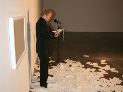 Man lasse alle herausgerissenen Buchseiten auf den Boden flattern. Trage sie anschließend zusammen und stopfe sie in eine Waschmaschine. Schließe dieselbe und schalte den Schonwaschgang mit viel Wasser ein. Nach ungefähr dreißig Minuten abpumpen und leicht schleudern. Man öffne die Waschmaschine und entnehme ihr den noch triefend feuchten Papierpulp. Wringe den Pulp und stopfe ihn in einen oben offenen, ca. 20 Zentimeter Kantenlänge messenden Acrylwürfel.